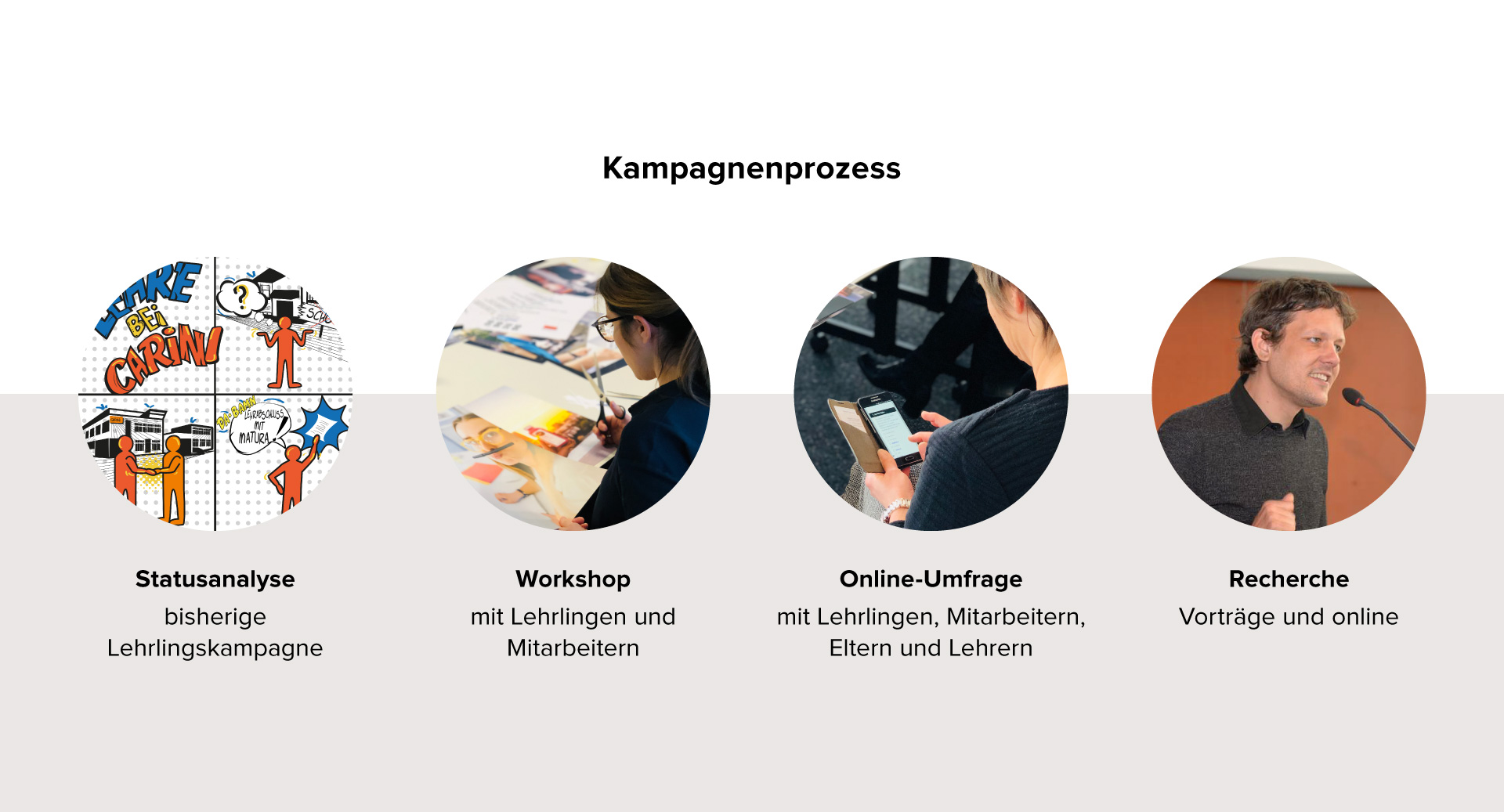 Um Aus­bil­dungs­plät­ze zu bewer­ben, ist es beson­ders wich­tig zu ver­mit­teln, was Eti­ket­ten CARINI aus­zeich­net und von ande­ren unter­schei­det. Und wer soll­te das bes­ser wis­sen als aktu­el­le Lehr­lin­ge und Mit­ar­bei­ter. Des­halb begann der Ent­wick­lungs­pro­zess auch mit einem Work­shop und einer Online-Umfra­ge. Auf Basis der gewon­ne­nen Erkennt­nis­se ent­stand die Grund­idee der Kampagne: